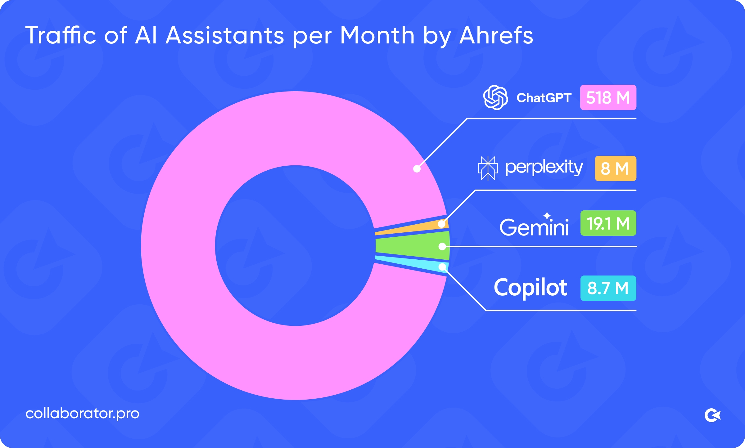 Monthly traffic of ChatGPT, Perplexity, Gemini, and Copilot according to Ahrefs.