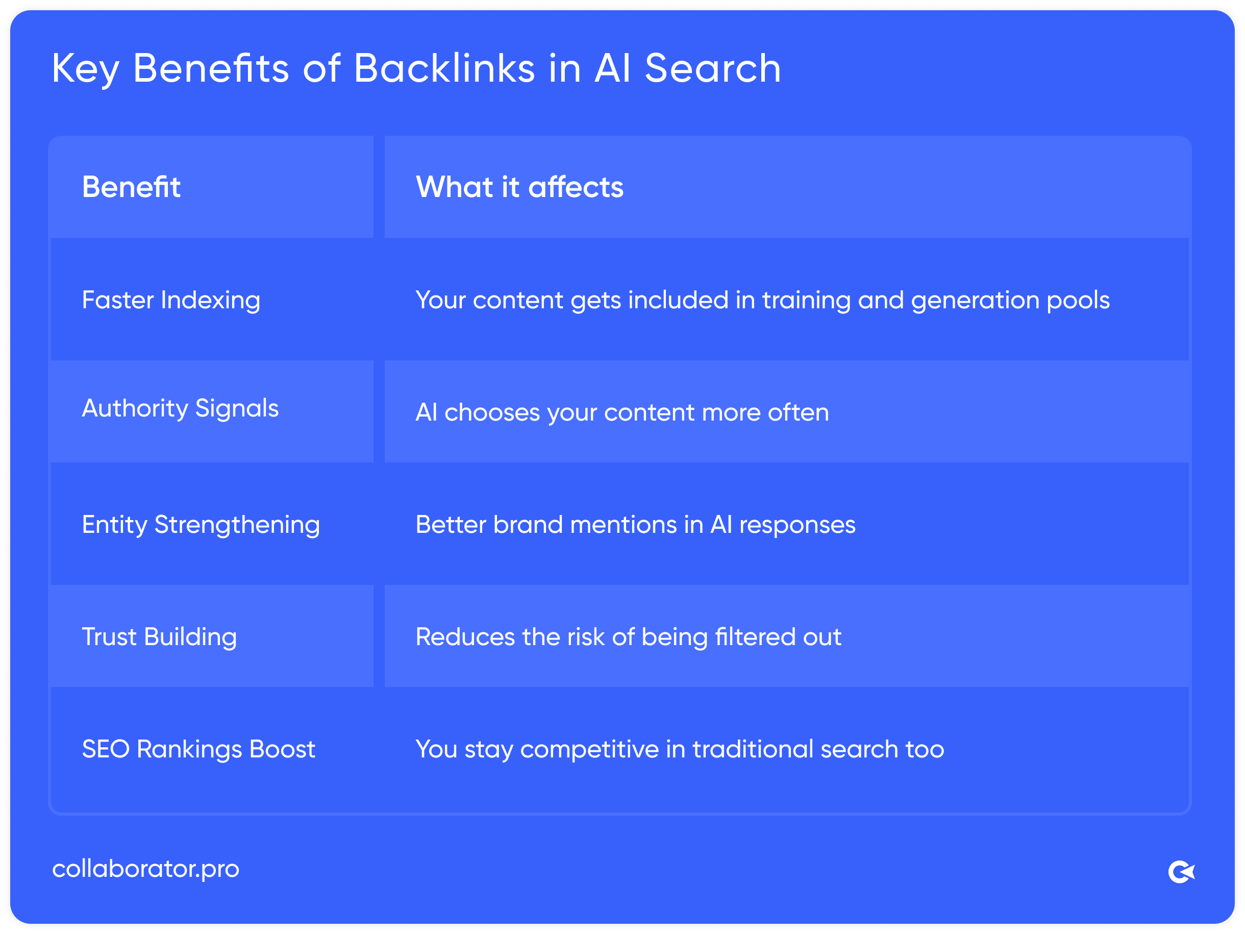 A table showing key benefits of backlinks in AI search, including faster indexing, authority signals, entity strengthening, trust building, and SEO rankings boost.