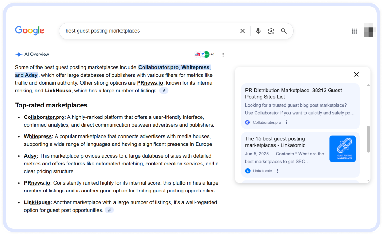 AI Overview results for the query "best guest posting marketplaces," including descriptions of Collaborator, Whitepress, and Adsy.