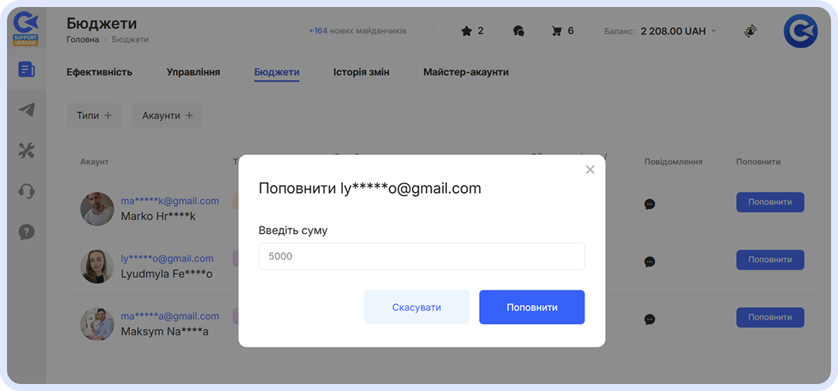 Модальне вікно поповнення бюджету в Майстер-акаунті: поле введення суми (5000) та кнопки «Скасувати» і «Поповнити»