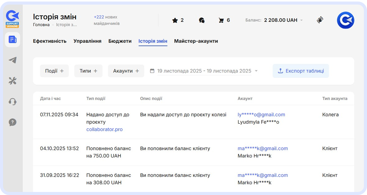 Сторінка історії змін у Майстер-акаунті з журналом подій: поповнення балансу та надання доступу до проєктів